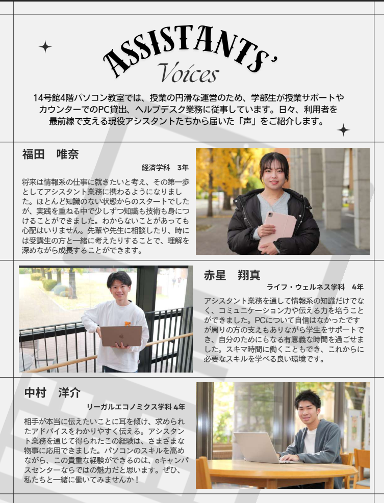 授業アシスタントの先輩方は優しい方ばかりです!パソコンの知識が優れていなくても、社会人になってから必要な能力が養えます。パソコンが好きな人はもちろん、教職を目指している方、サービス業に就きたい方にはおススメだと思います。