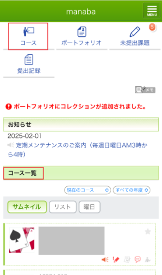 ホーム画面に表示してある「コース」または「コース一覧」から、目的の講義コースを選択して開くことができます。