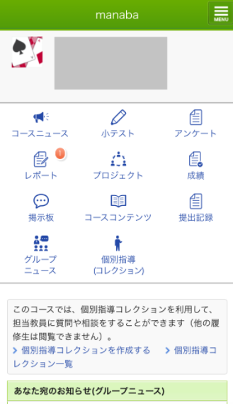 コースとは、各授業ごとに用意されたページで、授業資料、課題、テスト、連絡などの情報が掲載されています。