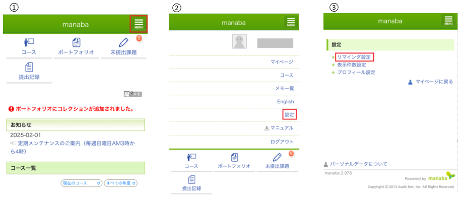 リマインダとは、manabaに新しいお知らせなどがあった場合、指定した条件などで通知する機能です。