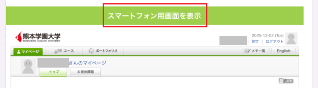 スマートフォンからmanabaにアクセスすると、画面上部に「スマートフォン用画面を表示」と表示されます。タップするとスマートフォン版の表示に切り替わります。